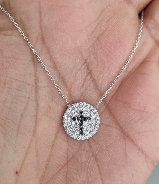 Black Cross Crystal Evil Eye Necklace with white zircons around for Good Luck - 925 Sterling Silver - Chain 40 to 45 cm Length, for Christmas, Wedding, Valentine's Day