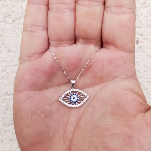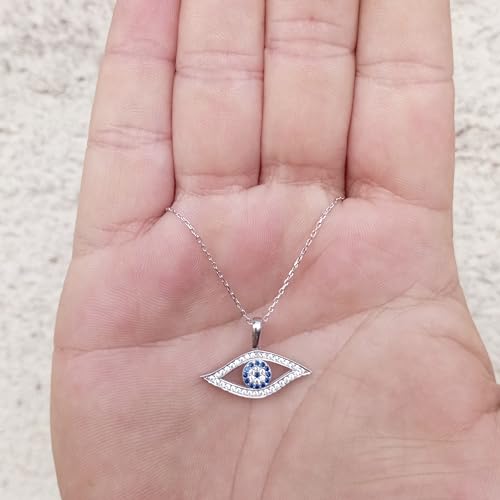 MYSTIC JEWELS - 925 Sterling Silver Necklace; Evil Eye Protector, Turkish Eye Pendant Necklace with Zircons, Eye Shape, Jewelry for Women
