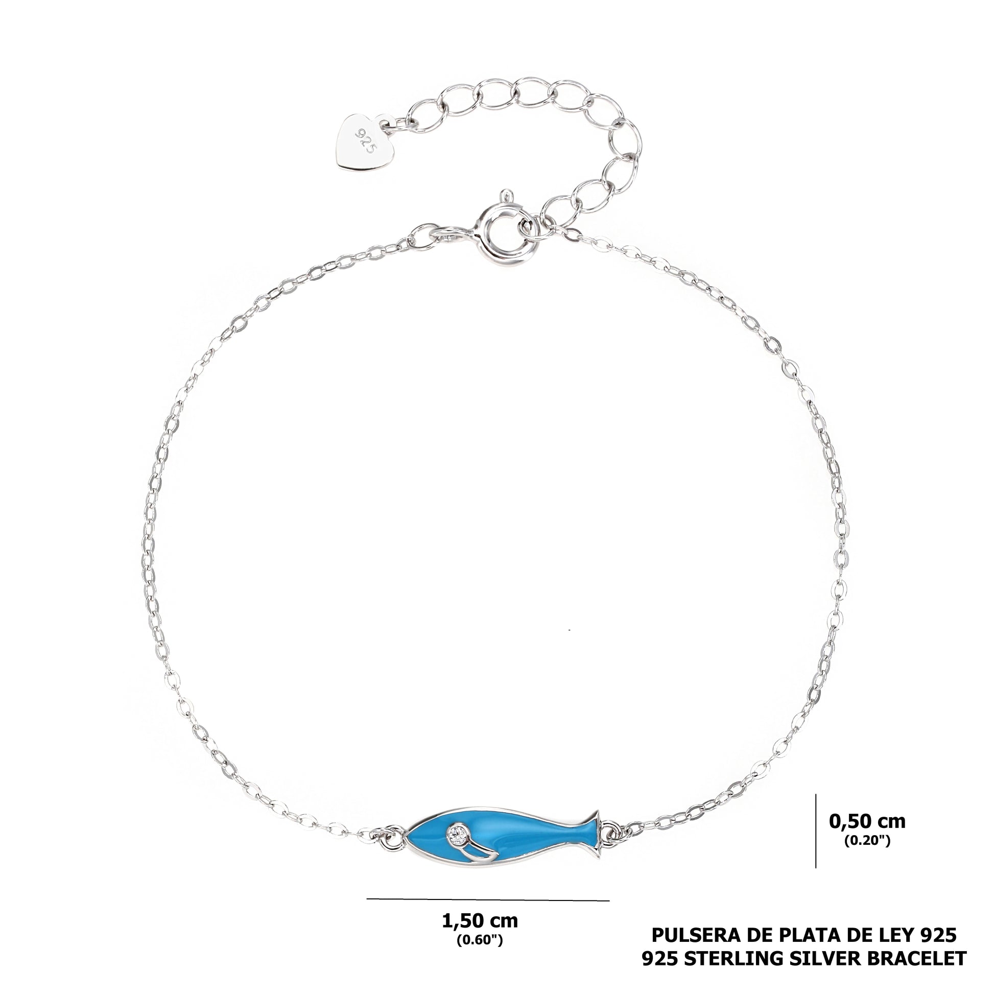 - Dije de Pez con Toque Brillante: Pulsera con charm de pez esmaltado en azul turquesa y una pequeña circonita cúbica en el ojo, símbolo de buena suerte y energía positiva.
