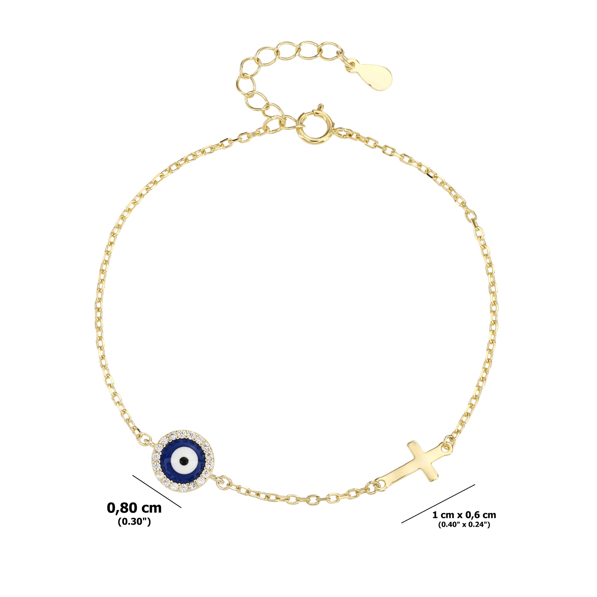 - Charm Dual con Significado: Cruz dorada (1 cm x 0,6 cm) y ojo turco (0,8 cm) con borde de circonitas.