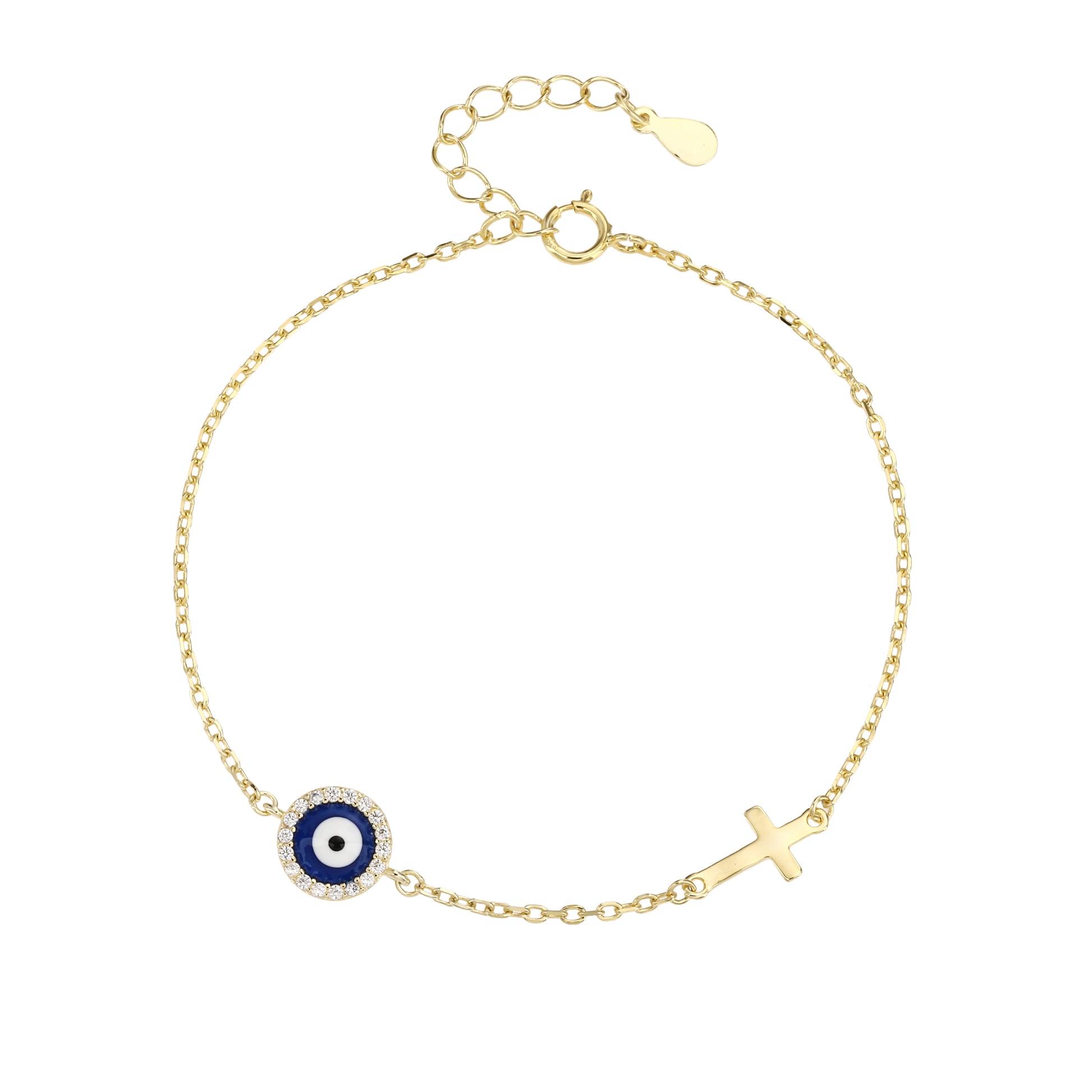 Pulsera de Plata de ley 925 - Bañada en Oro con Cruz y Ojo Turco – Diseño Minimalista con Circonitas – Ajustable 16 + 3 cm